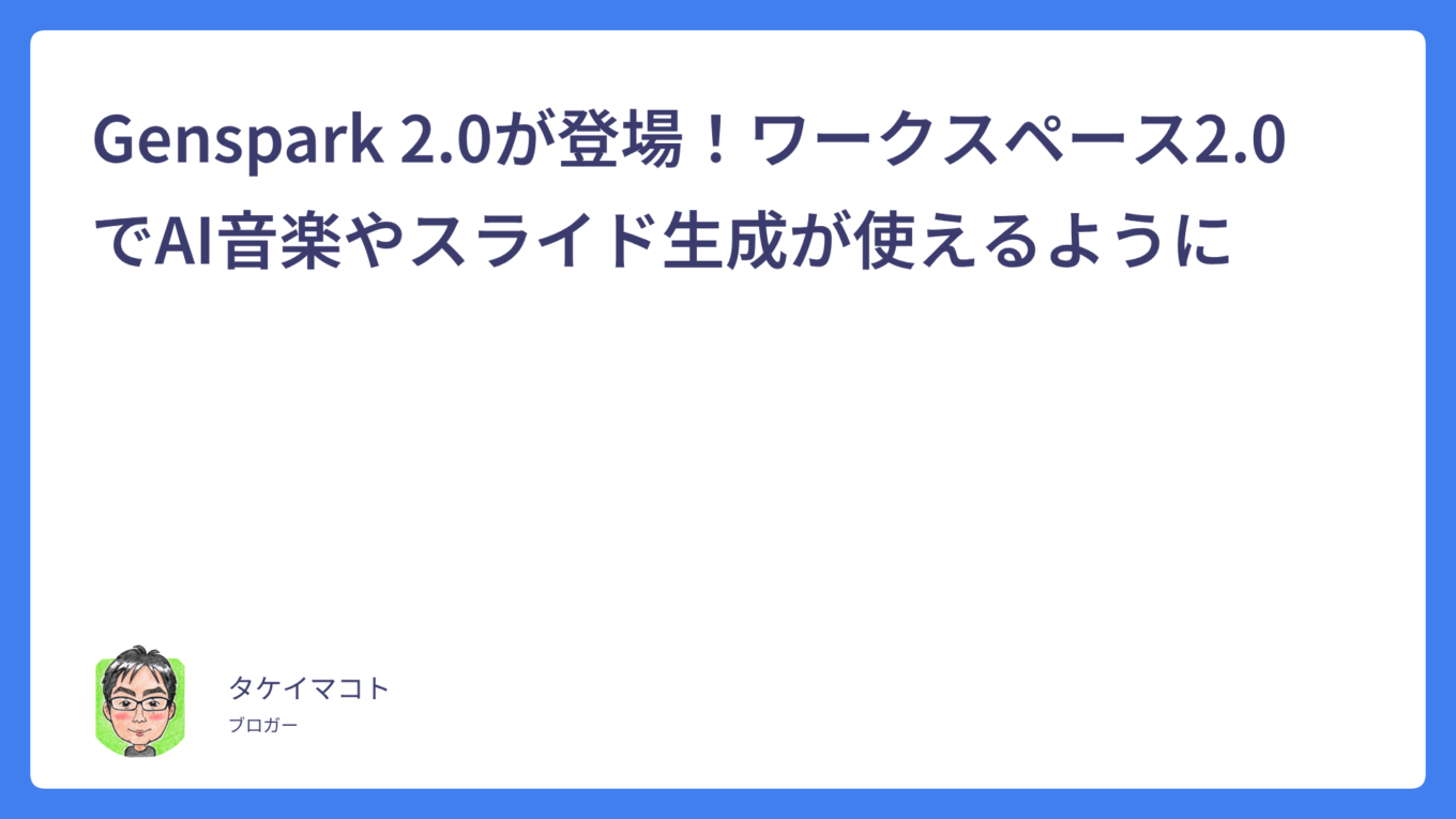 新着記事News Manusもくもく会レポート:2026年の新機能「Skill」を体験してきた 2026.02.06 検証 Genspark 2.0が登場!ワークスペース2.0でAI音楽やスライド生成が使えるように 2026.02.02 ニュース 【おすすめ】 Genspark|AI画像生成が無制限!アイキャッチ作成に超便利な5つの理由 2026.01.23 検証 ニュース 検証 比較・ランキング 当ブログの人気記事Popular Post 【生成AI】ブログ活動のために愛用しているアプリ 5選+1【2026年版】 40 views Manusもくもく会レポート:2026年の新機能「Skill」を体験してきた 2 views Genspark 2.0が登場!ワークスペース2.0でAI音楽やスライド生成が使えるように 2 views 【おすすめ】 Genspark|AI画像生成が無制限!アイキャッチ作成に超便利な5つの理由 2 views タケイマコトブロガーProfile1979年生のブロガーです。 ブログを5つ運営。 生成AIも大好き!生成AIの活法、ブログ情報発信の効率化に邁進しています。プロフィールを読むXFacebook