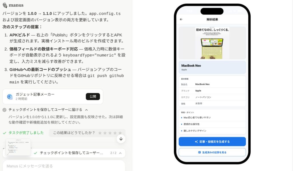 Manus AIの何がすごいかというと、アプリ開発をブラウザ上で完結できること。ウェブサイトもサーバーレスでそのままローンチできます。チャットでお願いして、公開まで一気通貫で完結できるのが気に入っています。