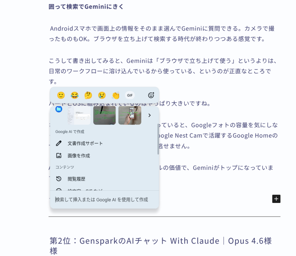 こうして書き出してみると、Geminiは「ブラウザで立ち上げて使う」というよりは、日常のワークフローに溶け込んでいるから使っている、というのが正直なところです。