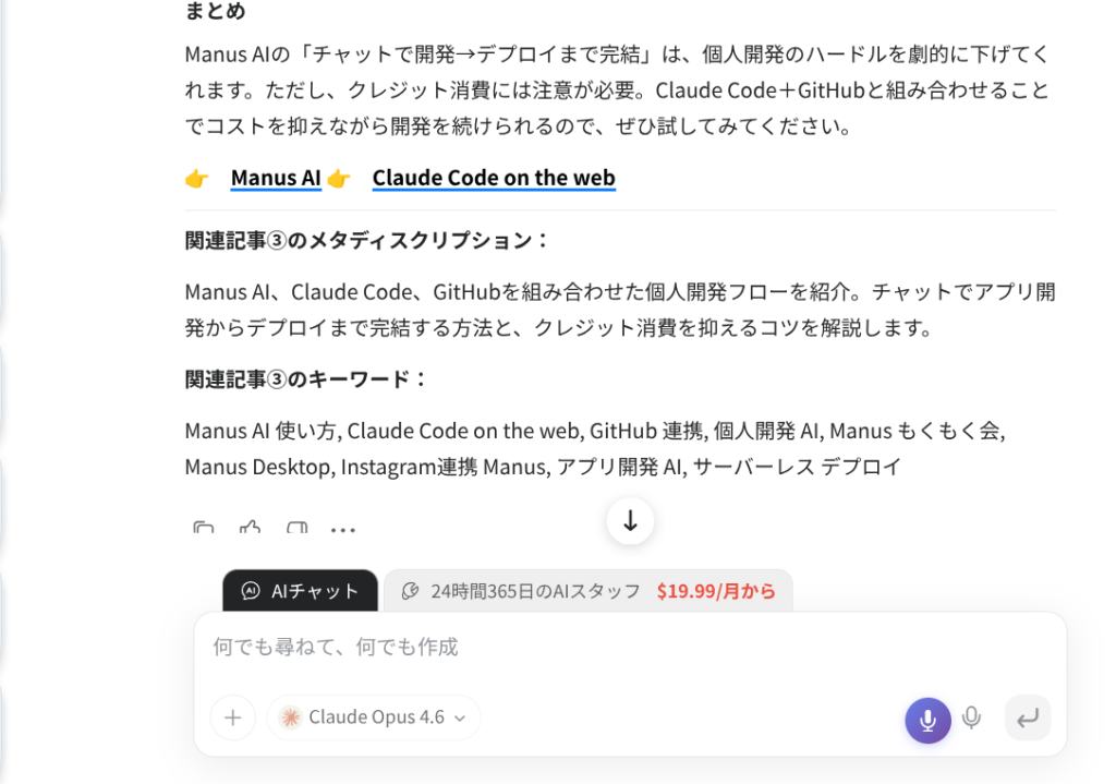 これが本当にありがたい。Genspark PlusやProプランに加入していれば、AIチャットでClaude Opus 4.6をいくら使ってもクレジットが減らないんです。ブログの文章作成って、何回もやりとりしながら仕上げていくので、100記事書いても制限にかからないのは最高ですね。