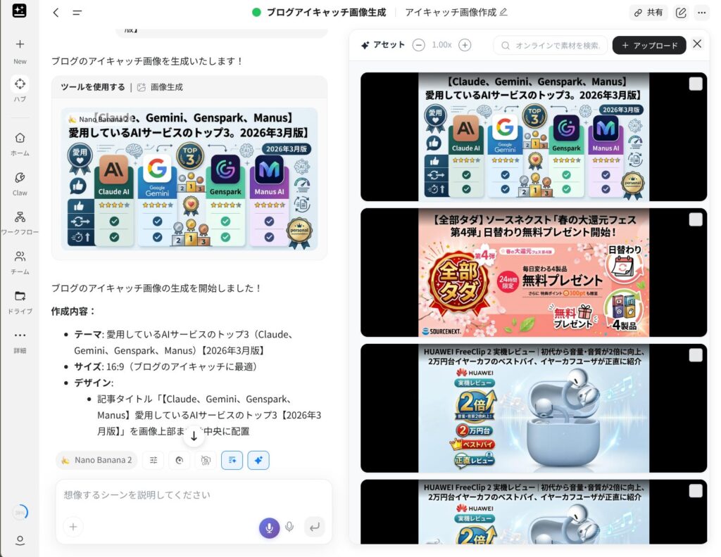 さらに嬉しいのが、AI画像生成もNano Banana Proが無制限で使えることです。Plus・Proプランなら枚数制限なし。しかもGensparkで生成した画像にはウォーターマークが入らないんですよね。これがめちゃくちゃ気に入っているポイントです。