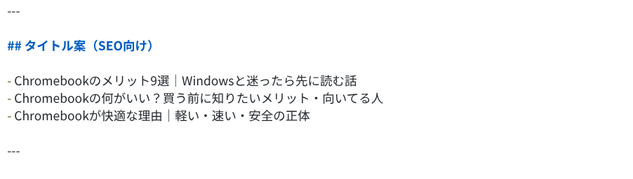 5.2 Proは「Chromebookのメリット9選|Windowsと迷ったら先に読む話」と、キーワードを凝縮したタイトルを出力しました。さらにSEO向けのタイトル案を3パターン、メタディスクリプション案まで自発的に提案しています。ブログ運営者がそのまま活用できる形式です。