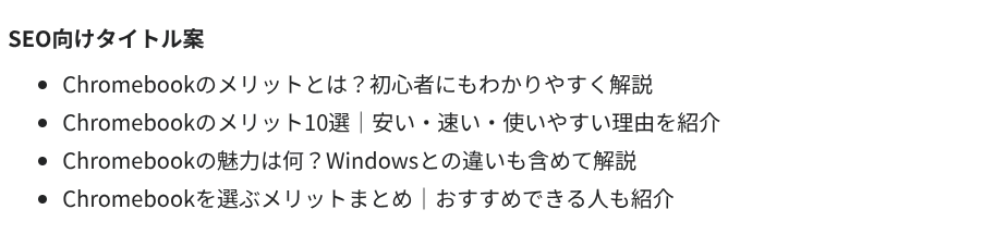 5.4 Proは「Chromebookのメリットとは?初心者にもわかりやすく解説」という説明型のタイトルです。検索意図に対してストレートに答える形で、初心者向けの記事としてはこちらのほうがマッチするケースもあります。ただ、タイトル案やメタディスクリプションの提案はありませんでした。