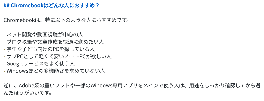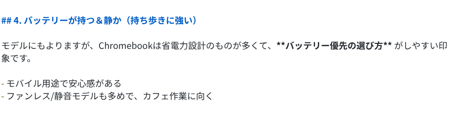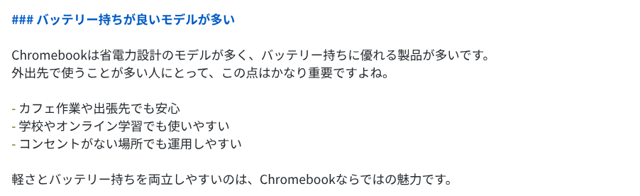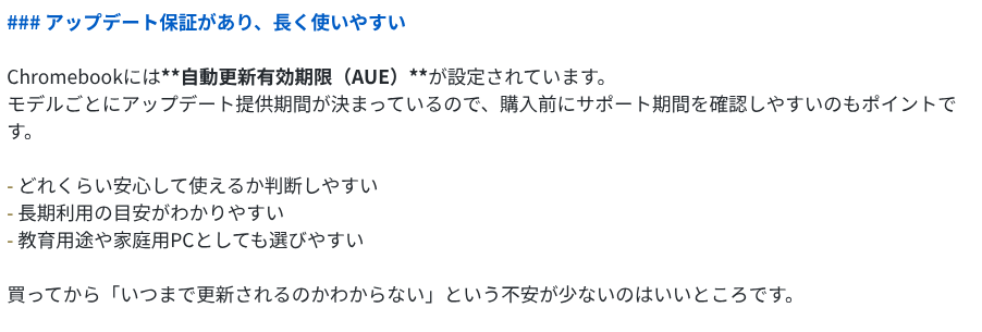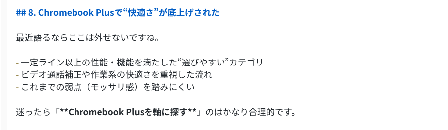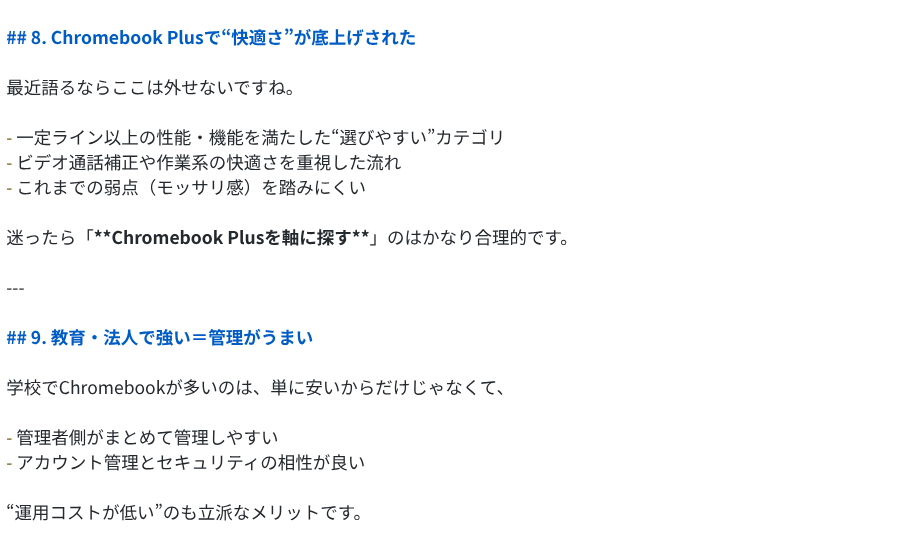 5.2 Proは9項目をテンポよく並べ、各セクションが短めにまとまっています。「Chromebook Plusで”快適さ”が底上げされた」「教育・法人で強い=管理がうまい」のように、切り口に変化をつけたセクションを混ぜているのがポイントで、記事全体にメリハリがあります。まとめも「速い・安全・ラク・クラウド前提で未来に合う」と4語に絞っていて、読後感がスッキリしています。