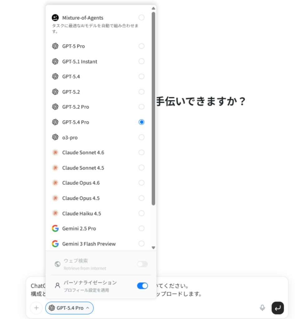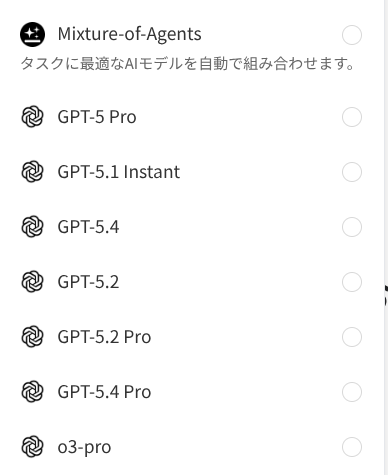 GensparkのAIチャットでは、ChatGPTの最新モデル(GPT-5.4 / 5.4 Pro)はもちろん、Claude、Geminiなど主要なLLMを自由に切り替えて使えます。