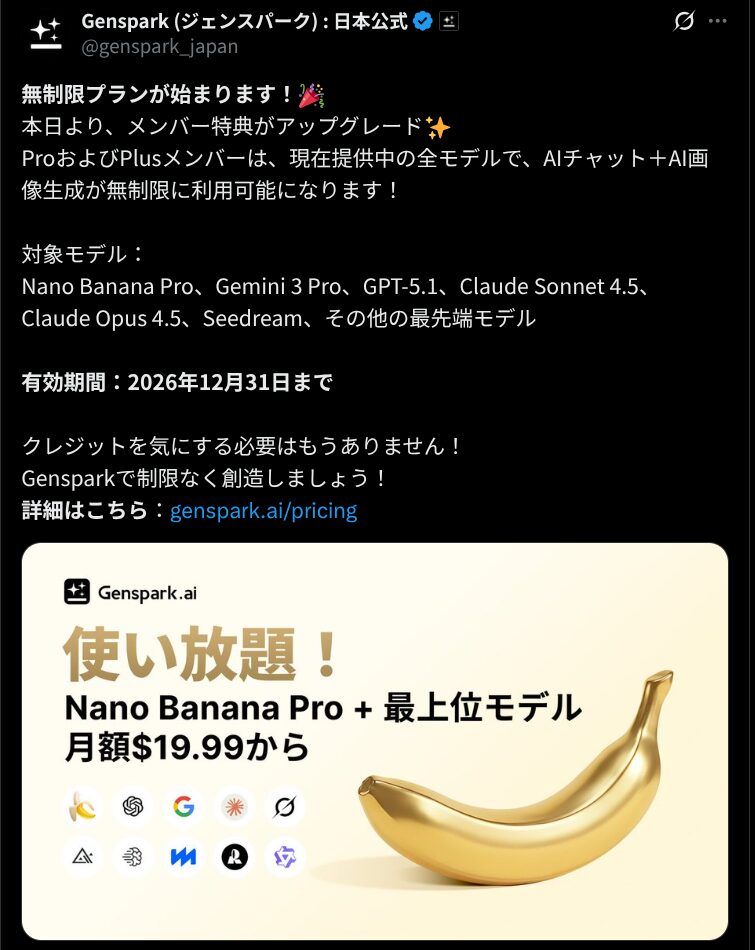 Gensparkの有料プラン(Pro/Plus)に加入すると、Nano Banana Proを含む複数のAIモデルが無制限で利用可能になります。