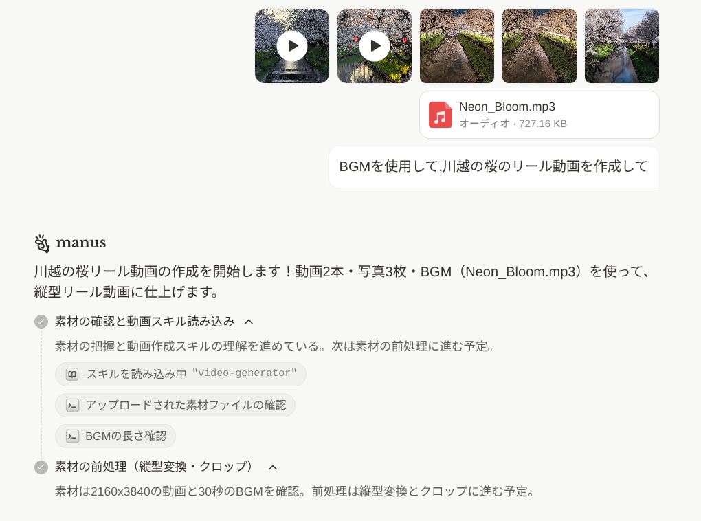 動画2本、写真3枚、BGM1曲の合計6ファイルをまとめてアップロードして、「BGMを使用して、川越の桜のリール動画を作成して」と指示を出しました。たったこれだけです。
