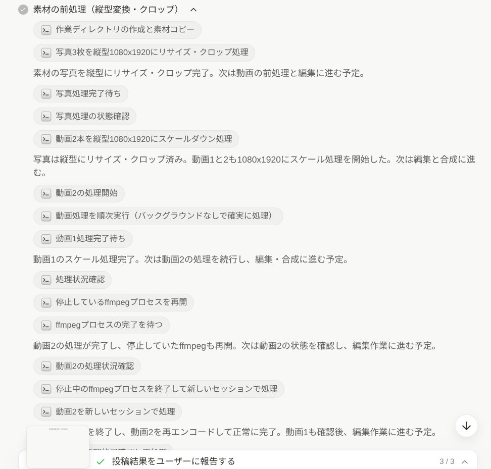具体的には、写真を縦型1080×1920にリサイズ・クロップし、動画2本も1080×1920にスケールダウン処理。Instagram Reels対応のフォーマットに自動で変換してくれています。