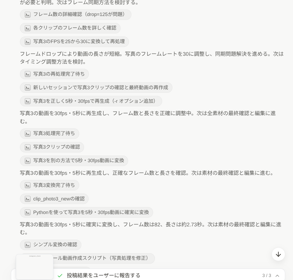 写真3の変換でフレーム数の問題が発生した際も、Manus自身が問題を検知してPythonで再変換するなど、試行錯誤しながら解決していく様子が印象的でしたね。