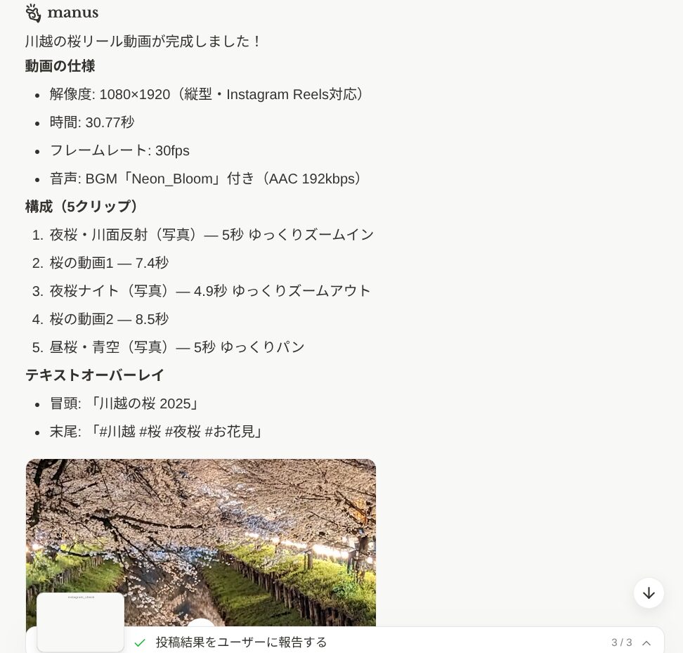 ManusのInstagram連携、特にリール動画の作成・投稿まで対応は本当にありがたいですね。