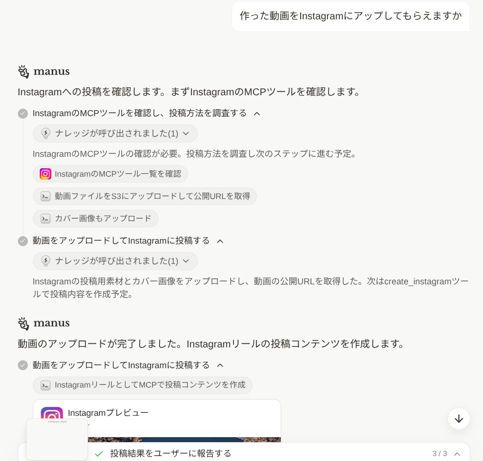 動画が完成すると、ManusはInstagramのMCPツールを確認し、動画ファイルとカバー画像をS3にアップロードして公開URLを取得。