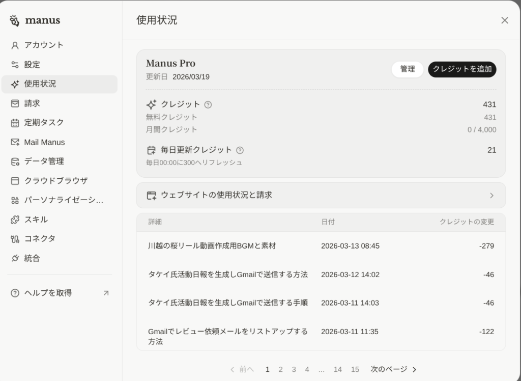 Manus Proプラン($20/月)の場合、毎日300クレジットがリフレッシュされるので、1日1本のリール動画投稿なら余裕で回ります。月間4,000クレジットもあるので、日次クレジットが足りない日があっても月間分でカバーできる計算です。