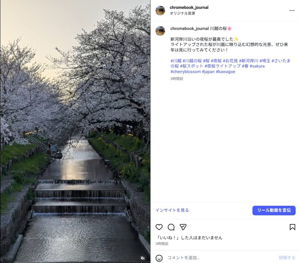#川越 #川越の桜 #桜 #夜桜 #お花見 #新河岸川 #埼玉 #さいたまの桜 #桜スポット #夜桜ライトアップ #春 #sakura #cherryblossom #japan #kawagoe といったハッシュタグまでしっかり付いていたのはナイスです。