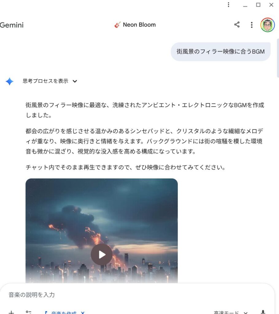BGMはGeminiで30秒のオリジナル楽曲「Neon_Bloom.mp3」を生成しました。著作権フリーの音源を探す手間が省けるのが地味にありがたいですね。