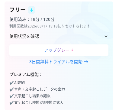 リアルタイム音声入力は1回3分まで、AI要約は月10回まで利用可能です。「どんな精度か確かめたい」くらいなら十分ですが、継続使用するならプレミアムプランが現実的です。