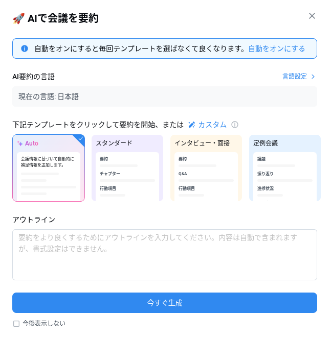 テンプレートをクリックするだけで、その業界や会議の種類に最適化された形式で文字起こし結果を整理してくれます。