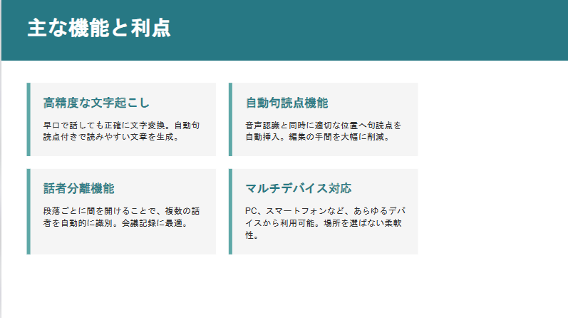 ChromebookやMacなど、専用アプリが入れにくい環境でも使えます。これができる文字起こしサービスって、意外と少ないんですよね。