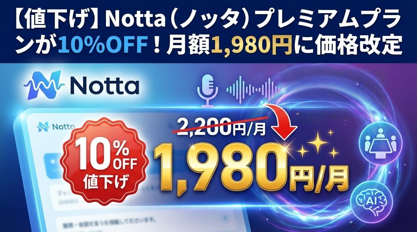 【値下げ】Notta(ノッタ)プレミアムプランが10%OFF!月額1,980円に価格改定【値上げラッシュの中で逆行する英断】 2026.02.23 セール・クーポン takemako AIライターズラボ